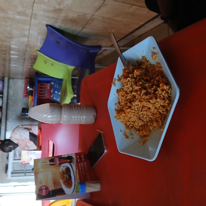 A plate of rice with a spoon on top sits on a red table in front of a half-eaten bottle of chocolate milk. A plastic Coca-Cola ad with a picture of fried rice sits on the red table next to a toothpick holder with a few toothpicks sticking out. Two plastic chairs with blue and green seats can be seen in the background of the image. A man wearing a dark shirt is visible in the very back of the image. The scene appears to be a restaurant. The location is an unnamed restaurant in Kufang, Nigeria, based on coordinates (latitude: 9.863, longitude: 8.867).