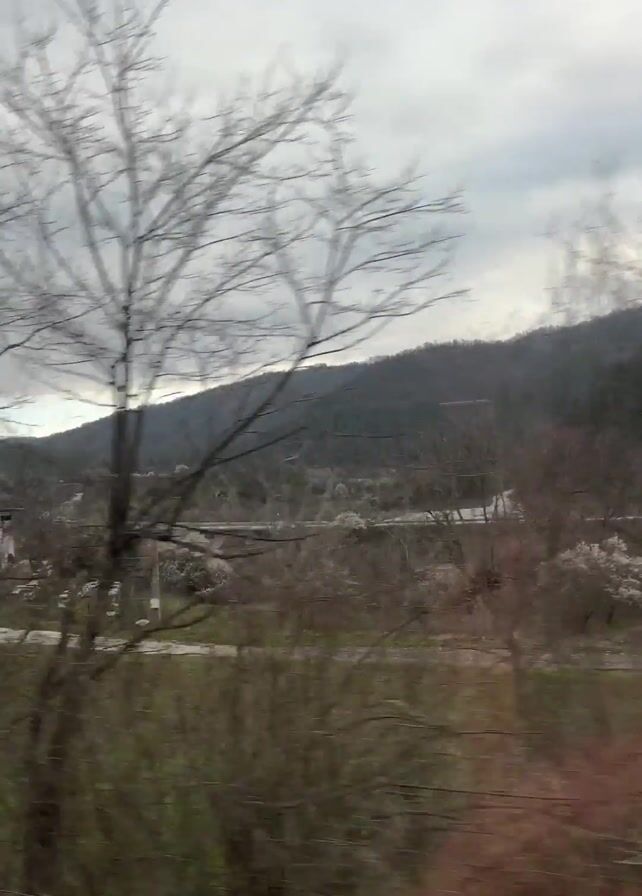 view from a moving train window, revealing a landscape with a backdrop of forested hills under an overcast sky. In the foreground, blurred bare trees give way to a field of green grass and a complex of buildings and roads. A small building and a blue vehicle are visible near what appear to be stacked hives. A person is seen walking in the distance near the building. Trees with white blossoms dot the area. The reflection of the train window is overlaid on the scene.