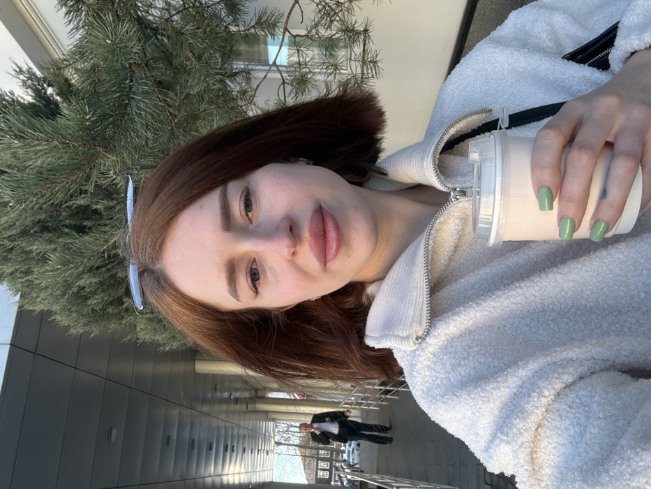 A female individual is depicted in a close-up, selfie-style photograph taken outdoors in the city of Rusanovo, Russia