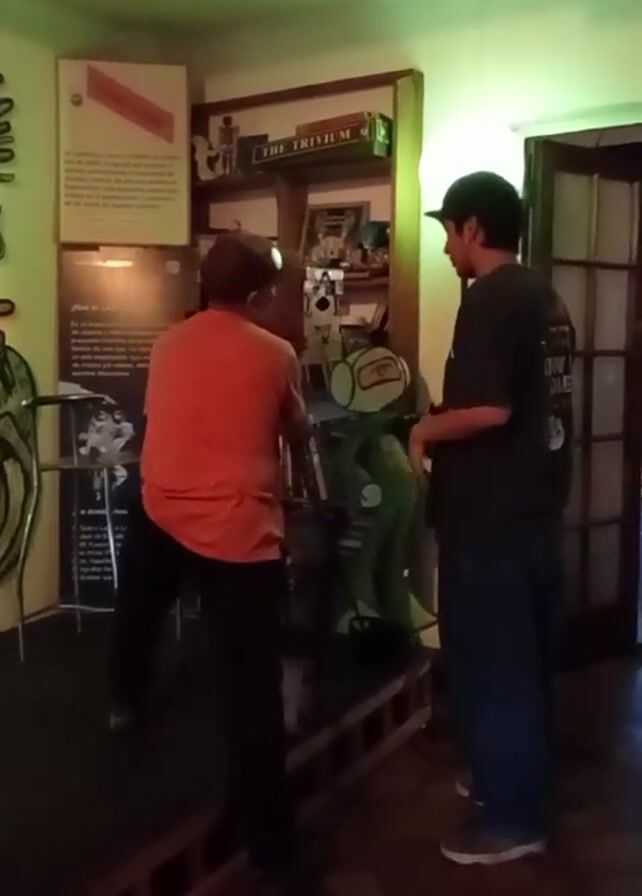 Two men are standing on a small stage in an indoor space. The man on the left is wearing an orange t-shirt and black pants, while the man on the right is wearing a black t-shirt, blue jeans, and a black baseball cap. They are both looking at a green, robot-like figure that stands between them. Behind them is a wooden shelf with various objects on it and several framed posters on the wall. The lighting in the room is greenish. The man in the orange shirt appears to be adjusting something on the robot figure.