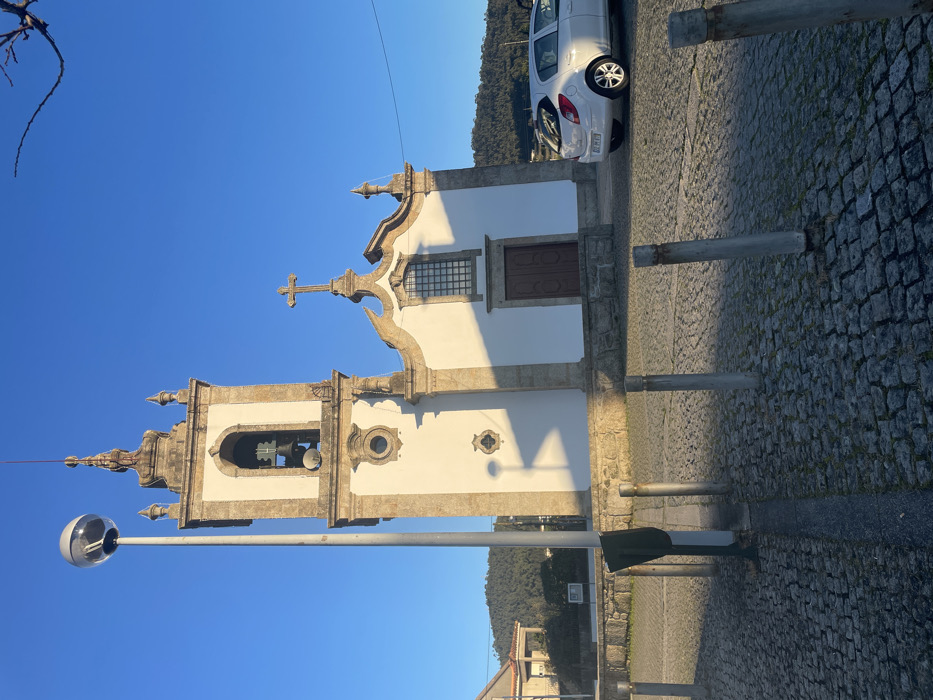A white church with a stone bell tower rises against a clear blue sky. A cross adorns the top of the building. A modern lamppost stands to the left. A white car is parked nearby on a cobblestone street. Metal bollards line the edge of the street in front of the church. A hillside covered in trees is visible in the background.