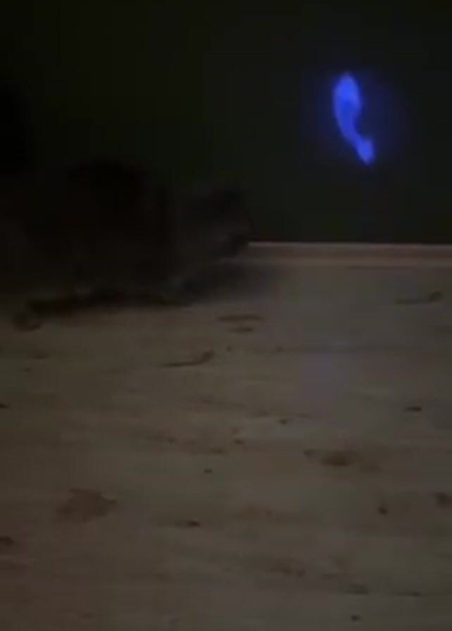 A blurry video shows a gray cat playing in a room with a wooden floor and a dark green wall. A blue light toy is attached to the cat’s tail and the cat chases its tail in a circular motion. The cat runs, jumps, and spins around.