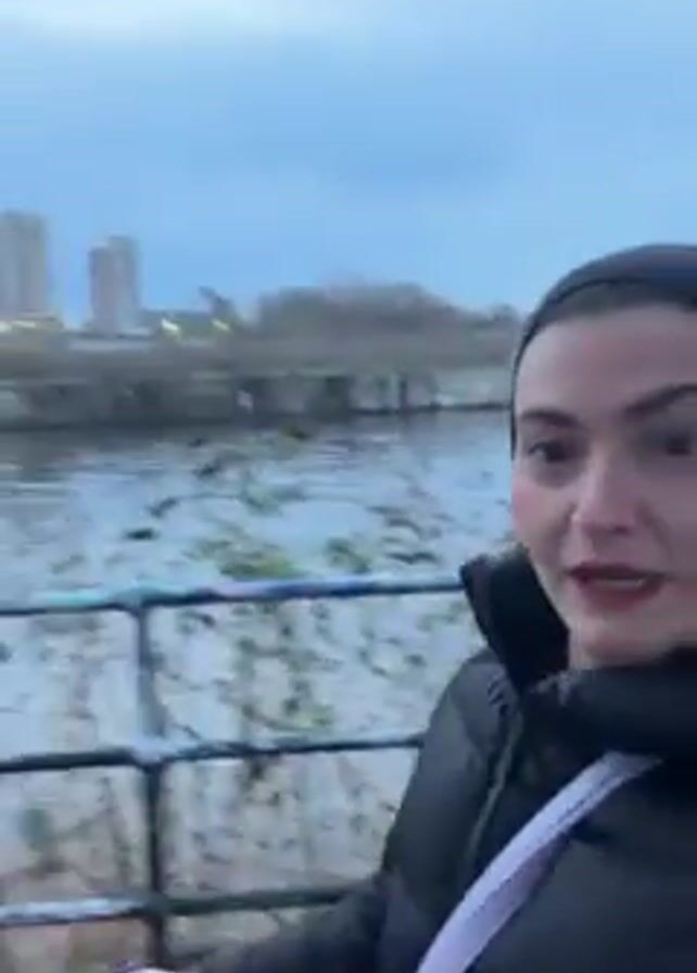 A woman wearing a black headband and a black puffer jacket holds up her phone to record a vlog. Behind her is a body of water and across that is a cityscape with tall buildings. The woman is walking along a sidewalk next to a wrought iron railing that separates the sidewalk from the water. The sky is overcast. The water is moving rapidly and there are some low plants growing near the railing.