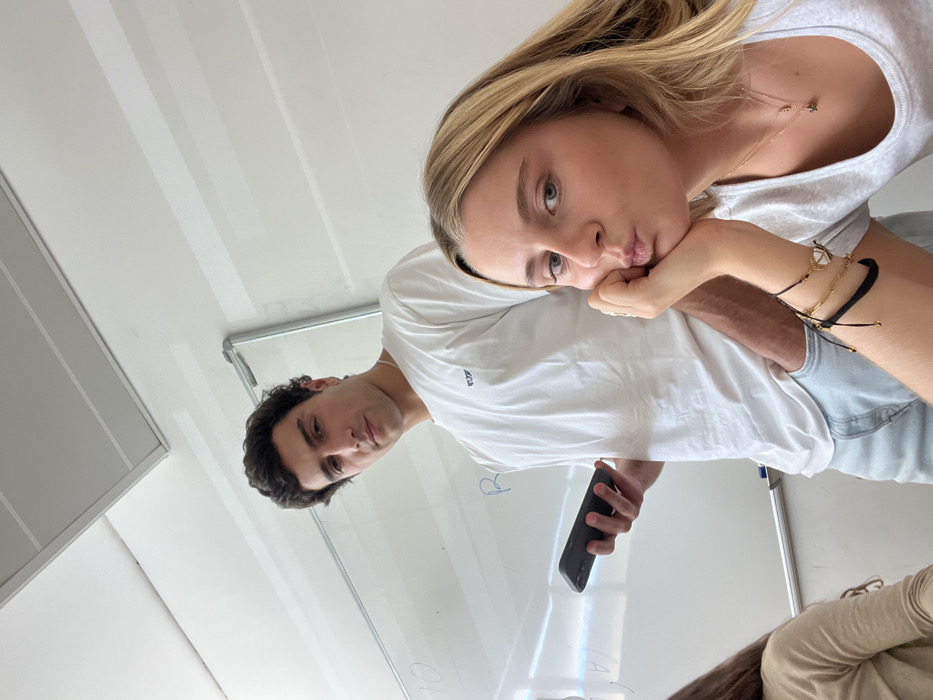 An indoor scene features two individuals: a blonde female in the right foreground and a dark-haired male standing slightly behind her to the left. The female, wearing a light-colored t-shirt, multiple necklaces, and bracelets, pouts directly at the camera with her left hand cupping her chin. The male, dressed in a white t-shirt with a dark chest logo and light-wash jeans, holds a black smartphone in his right hand and has his left hand in his pocket, also looking directly at the camera with a neutral expression. Behind the male, a large white board is mounted on a white wall, displaying blue handwritten text including "RIO," "R," and mathematical notations like "(A)." The ceiling is white, featuring a single rectangular light fixture in the upper left. The specific location within the city of Oeiras, Portugal, is not discernible from the visual information provided.