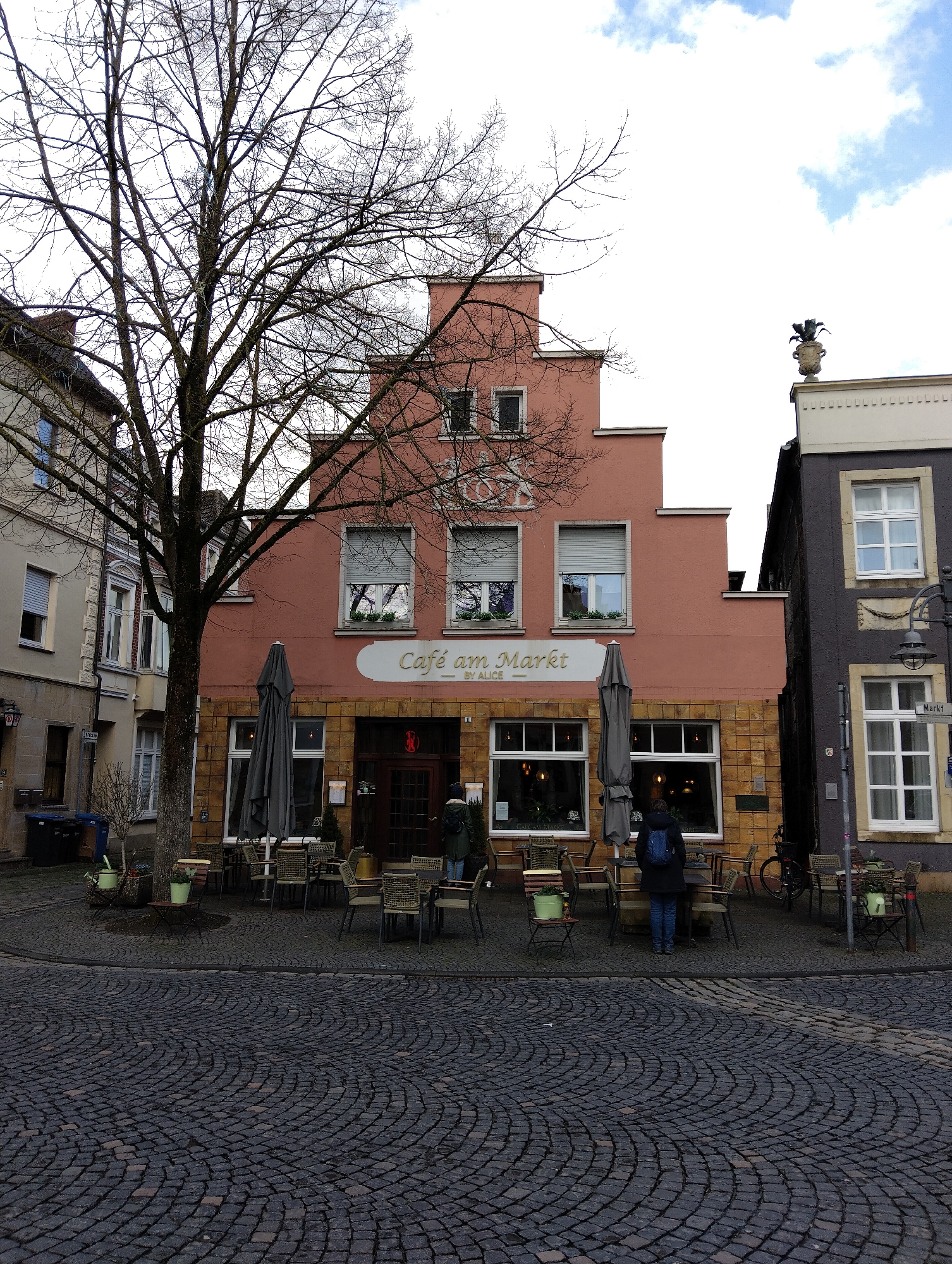 The image depicts a street scene in Burgsteinfurt, Germany, specifically around a market square. The central focus is "Café am Markt," a two-story building featuring a distinctive pinkish-red facade with a stepped gable roof and an ochre-yellow stone block ground floor. The cafe's entrance consists of brown double doors with glass panels. Above the entrance, a white oval sign reads "Café am Markt," with "BY ALICE" in smaller text below it. Outdoor seating arrangements, including numerous small square tables and matching chairs made of a wicker-like material, are present on the dark grey cobblestone pavement, which is laid in a fan pattern. Two large grey folded umbrellas are positioned over the seating areas. Several small green potted plants are used as decoration on tables and around the base of a prominent, leafless deciduous tree that stands centrally in front of the cafe. To the left of the cafe, a lighter beige/cream building with multiple windows and roller shutters is visible. To the right, a dark grey building with white-framed windows features a decorative urn-like planter on its roofline. A lamppost with a "Markt" street sign is situated near this building. One individual, wearing a dark jacket and a blue backpack, stands with their back to the viewer, facing the cafe's entrance. Another person is partially visible near the cafe's doorway, seemingly engaging in an interaction. A black bicycle is parked near the cafe's right side, and two black refuse bins are visible to the far left. The sky overhead is partly cloudy, displaying patches of blue and white clouds.