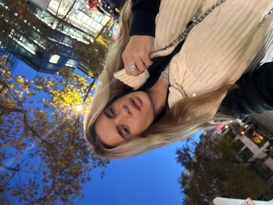 A fair-skinned female individual with long, straight blonde hair and blue eyes is positioned in the foreground of an urban street scene in Berlin, Germany, at dusk or night. Her head and upper torso are visible, with her gaze directed towards the camera. She has prominent lips. The individual is wearing a light-colored, possibly cream or off-white, ribbed puffer vest with a silver-colored chain detail on the zipper pull, over a dark long-sleeved top and a grey t-shirt. On her left ring finger, a stack of multiple rings, including a prominent silver-colored ring, is visible. Her left hand is raised, holding the collar of her vest. The background features a deep blue twilight sky. Above and to the left, trees with yellow-orange autumn foliage are illuminated by a visible street lamp. To the right, a multi-story modern building with a glass facade and numerous lit windows is present. Further to the right and lower, blurred red and white lights indicate either vehicle traffic or illuminated commercial establishments, characteristic of a busy city street environment.