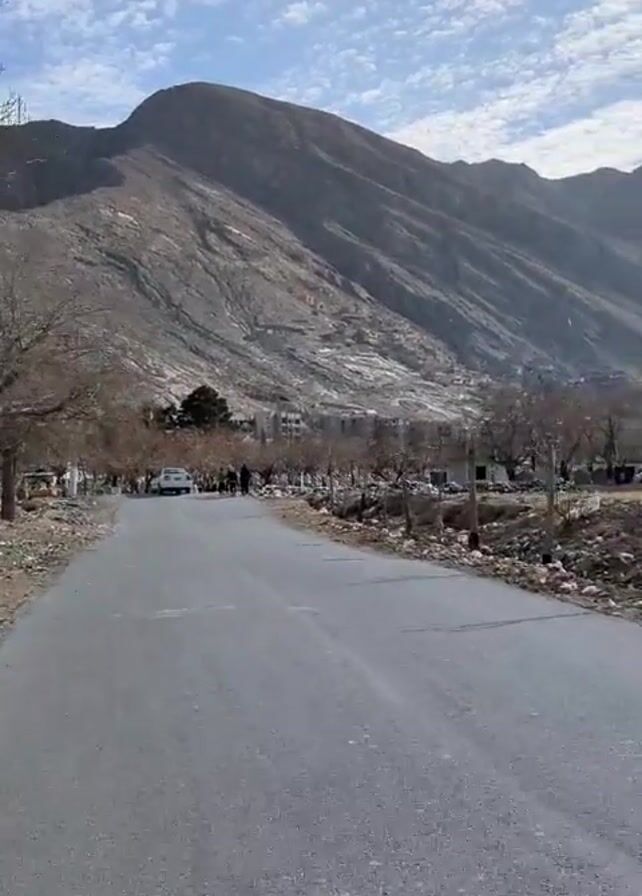 straight, paved road leading towards a mountain range under a partly cloudy sky. The road is flanked by trees with bare branches and glimpses of what appears to be a village or settlement. A few individuals are walking along the roadside. Several parked cars are visible in the distance near the trees. The overall environment seems mountainous and somewhat barren.