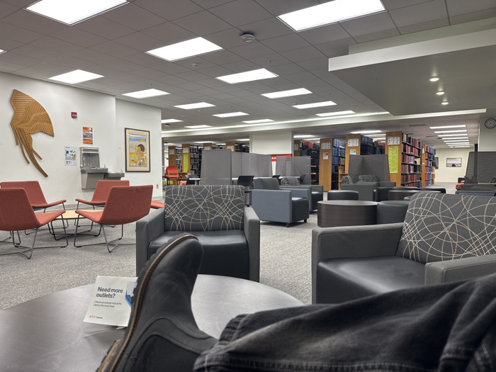 A library lounge area features various seating options, including orange chairs around a small table, and gray armchairs with patterned pillows. Bookshelves line the background. A wall display includes an abstract wooden sculpture, a water fountain, and a framed poster. In the foreground, a person's leg wearing a black boot rests on a table, next to a promotional pamphlet. The room is brightly lit by recessed ceiling lights.