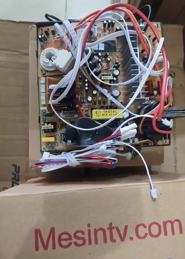 close-up view of a circuit board, presumably from a CRT television, sitting on top of a cardboard box with the words "Mesintv