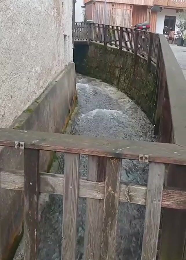 The video depicts a narrow, fast-flowing canal of water contained by stone walls. The perspective is from a small wooden bridge that spans the canal. The water is turbulent and slightly opaque. On either side of the canal are buildings, one a light-colored stone building and the other a wooden structure with multiple windows and balconies. The buildings create a narrow passageway for the canal. The video appears to have been taken on an overcast day.