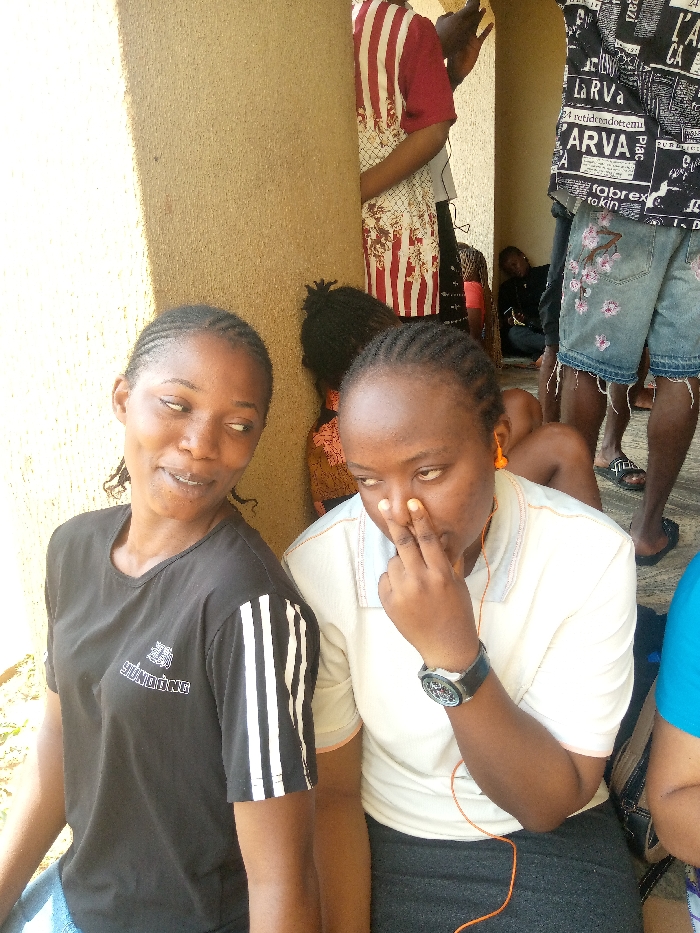 The image depicts a scene in a brightly lit, semi-enclosed architectural space in Nsugbe, Nigeria, possibly a covered walkway or veranda with a light-colored pillar. In the foreground, two women are positioned. The woman on the left, with dark skin and braided hair, wears a black short-sleeved t-shirt featuring white stripes on the right sleeve and a white text logo on the chest. She is looking upwards and to her right, away from the camera, with her mouth slightly open in a subtle smile. Her eyes show visible sclera below the iris. The woman on the right, also with dark skin and braided hair, wears a light-colored polo shirt with orange trim and a dark-colored lower garment, possibly a skirt or trousers. A black wristwatch is on her left wrist, and orange wired earphones are visible around her neck and chest. Her left hand is raised, with her index and middle fingers touching her nose. Her gaze is also directed upwards and to the right, away from the camera, similar to the woman beside her. A light-tan colored pillar stands vertically behind the two foreground women. In the mid-ground, behind this pillar, a person wearing a red and white striped garment is partially visible. To the right of the pillar, another individual is standing, wearing a black and white patterned short-sleeved shirt and faded, ripped denim shorts with pink floral embroidery. Further in the background, a fourth person is visible, seated or resting in a darker recess against a wall. The floor surface appears to be a light-colored, possibly paved or tiled, material.