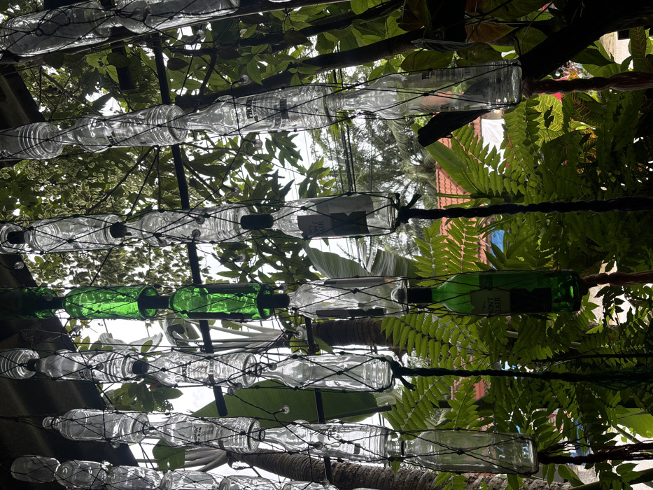 - "The image depicts a decorative installation of suspended recycled glass bottles, functioning as a semi-transparent screen or curtain, within an outdoor, lush tropical environment in Khlong Sok, Thailand" by FM-bmo3E3, licensed under CC BY 4.0