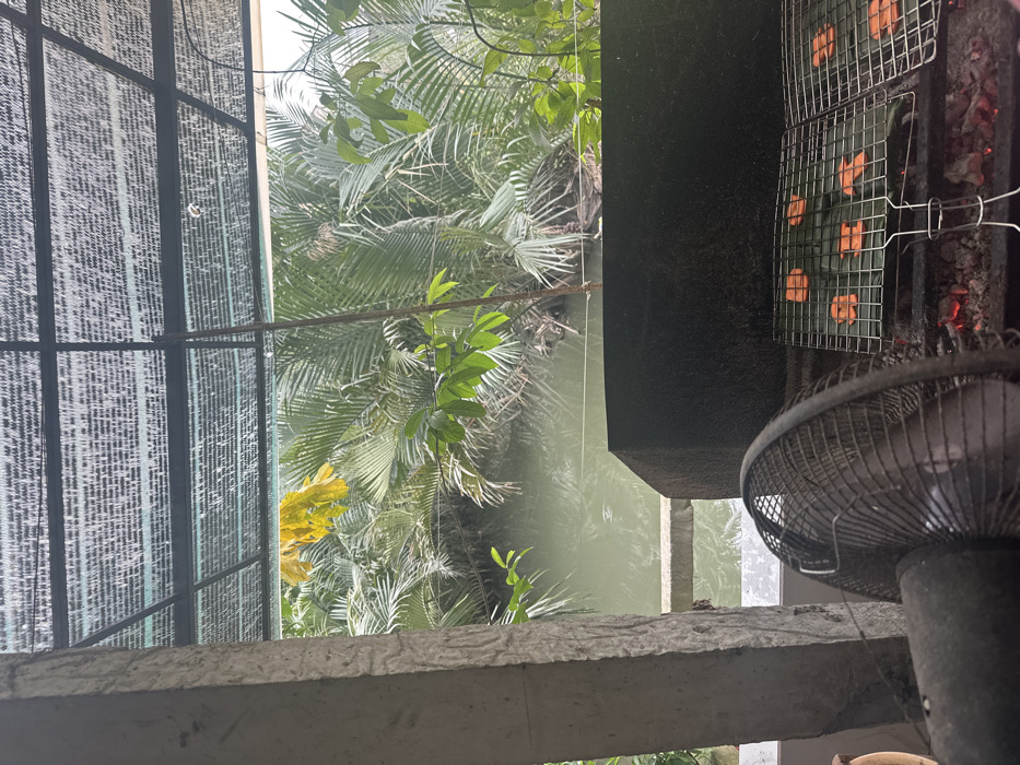 An outdoor scene is captured from a high angle, with a partial view of a grill. Food items are arranged on the grill grates. The grill is positioned adjacent to a dense, tropical landscape with lush trees and a body of water. A fan is visible in the foreground, partly obscuring the view. The composition includes a window screen and a concrete structure, adding depth and context to the image.