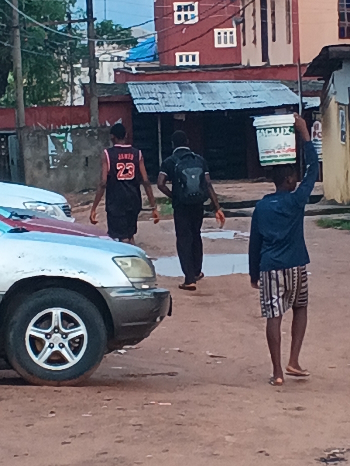 The image depicts an unpaved, reddish-brown dirt road in Onitsha, Nigeria, featuring scattered debris and small puddles. Three individuals, appearing male, walk away from the viewer. On the far left, a person wears a black sleeveless jersey with "JAMES 23" in pink and black shorts. The middle person wears a dark shirt, dark trousers, a black backpack, and flip-flops. The person on the right wears a dark blue long-sleeved shirt and vertically striped shorts, balancing a white bucket with a green "BAGLUX" label on their head, supported by their raised left arm, and wears flip-flops. In the immediate foreground, the front quarter of a light-colored SUV with a five-spoke silver rim is partially visible on the left, with a dark red vehicle partially behind it. The background features a red multi-story building with white-framed windows, partially obscured by a lower structure with a corrugated metal roof. Utility poles and overhead wires are visible on the left.