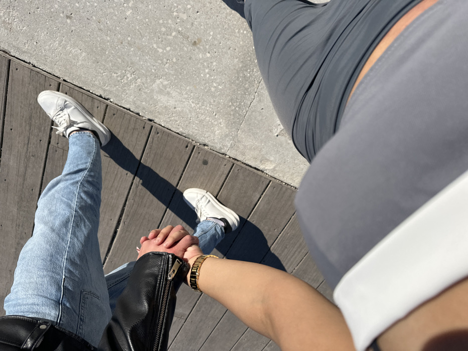 The image, captured from an overhead, first-person perspective, depicts two individuals walking outdoors on a sunny day in Altea, Spain. In the foreground, the camera holder's left forearm, adorned with a gold-toned wristwatch, extends forward from the lower left frame, holding the right hand of a second person. This individual is dressed in light blue denim jeans, a black leather jacket with a visible zipper on the sleeve, and white sneakers with black socks. Their left leg is positioned on a dark brown wooden plank surface. To the right, a textured light gray concrete path runs parallel to the wooden surface. Strong sunlight illuminates the scene, casting distinct shadows of the second person's body and legs onto the wooden planks. The camera holder's torso, wearing a light gray top, and lower body, dressed in dark gray pants, are partially visible on the bottom right and center right of the frame.