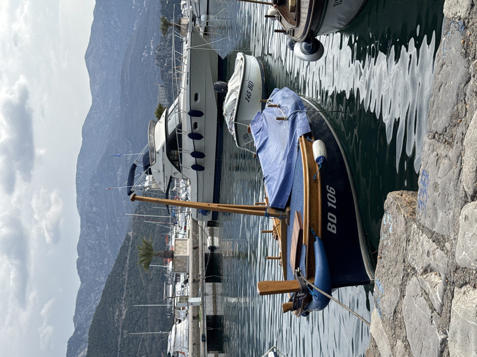 The image depicts a marina in Budva, Montenegro, under an overcast sky. In the immediate foreground, a weathered stone quay is visible, presenting a rough, grey texture. Moored to this quay is a dark blue, clinker-built boat, registered "BD 106", with natural wooden gunwales and a visible wooden mast or spar extending vertically. The boat's interior is partially covered by a wrinkled blue tarp, secured to the wooden trim. A blue cylindrical fender is attached to the bow, and a white cylindrical fender is visible along its starboard side. To the right, a portion of another wooden boat, with a white cylindrical fender, is present. In the midground, directly behind the dark blue boat, a smaller white boat registered "145 BD" is moored, its interior fully covered by a white tarp. Further back and positioned prominently is a larger white motor yacht, registered "HVM-0463", featuring a white cabin superstructure, tinted windows, a radar arch, and a blue canvas bimini top. Four dark blue cylindrical fenders are suspended along its starboard hull. The background encompasses a busy marina with numerous other vessels, including sailboats with visible masts and additional motor yachts, moored at various docks and piers. A concrete pier with a solitary palm tree in a planter is discernible. Dominating the distant background are large, rugged mountains, partially covered with sparse vegetation, rising under a cloudy, grey sky. Reflections of the boats and sky are visible on the calm water surface. No individuals are present within the captured scene.
