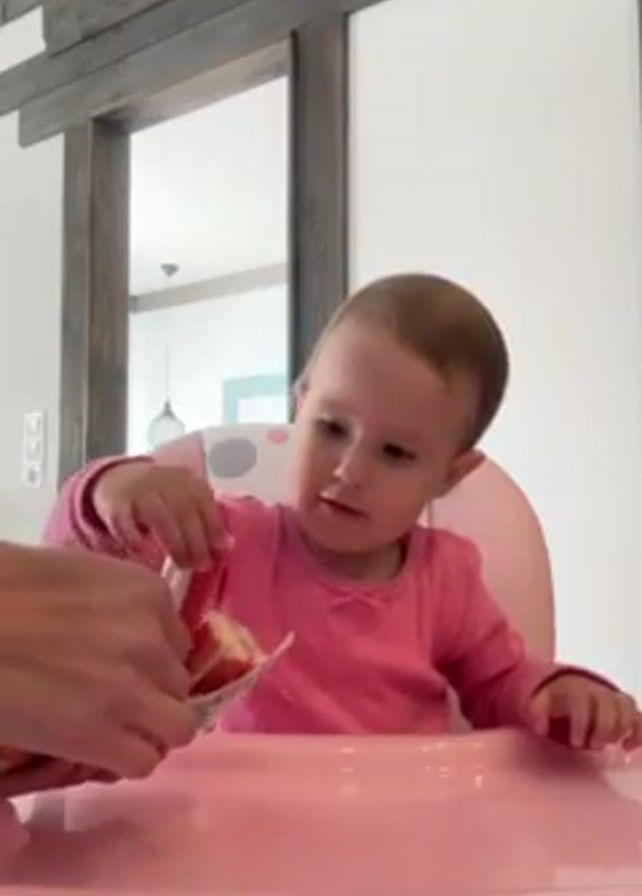 A woman's hands are opening a plastic package containing many red-and-white colored crab sticks. The sticks are being placed in front of a small child wearing a pink shirt, who is sitting in a pink high chair. The child looks at the crab sticks, picks them up, and examines them with their hands. A gray wooden mirror frame is behind the child.