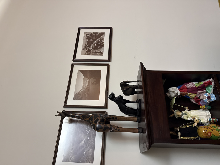 Three framed sepia-toned photographs are stacked vertically on a beige wall. A wooden cabinet with carved trim sits to the right, containing several dolls including a patchwork doll, a rabbit doll with an umbrella, and a Russian nesting doll. A wooden giraffe figurine stretches horizontally from behind one of the photos into the cabinet. A cat and bird wooden figurine also rest atop the cabinet.