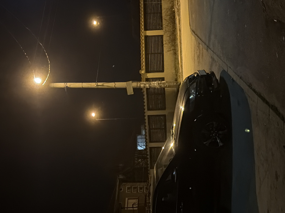 The scene depicts a nighttime street in Mokrishte, Bulgaria. A dark-colored sedan, possibly black, is parked on the right side of a paved street, facing right. The front half of the vehicle is visible, illuminated by a streetlamp. Its front bumper displays a light-colored license plate. The front wheel features multi-spoke dark alloy rims. To the right of the vehicle, a curb separates the road from a narrow, unpaved shoulder. Three streetlights illuminate the area. A prominent, light-colored utility pole with a single bright yellow-orange lamp stands in the mid-ground, slightly right of center. Electrical wires extend from this pole. Two additional, taller streetlamp poles with similar yellow-orange lamps are visible further in the background. To the left, a multi-story building with visible windows and a balcony is partially obscured. Behind the parked car and extending across the mid-ground is a light-colored fence or wall with horizontal louvered sections, topped with terracotta-colored tiles. Beyond this fence, another building with a single lit window is discernible in the distance. The overall environment is dark, with artificial lighting providing localized illumination. No individuals are present in the image.