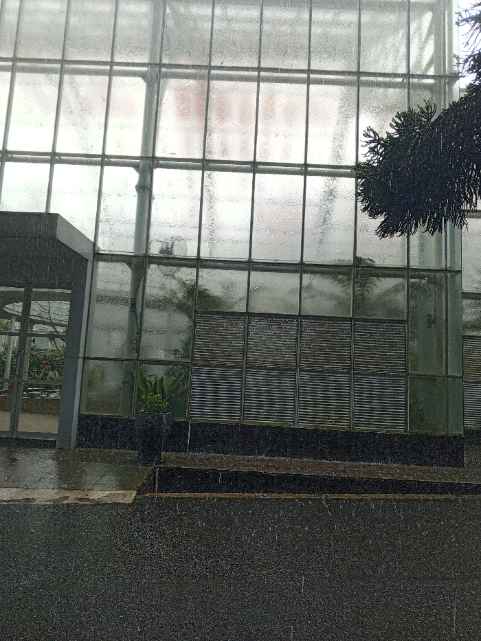Rain streaks down a large greenhouse with glass panes and metal supports
