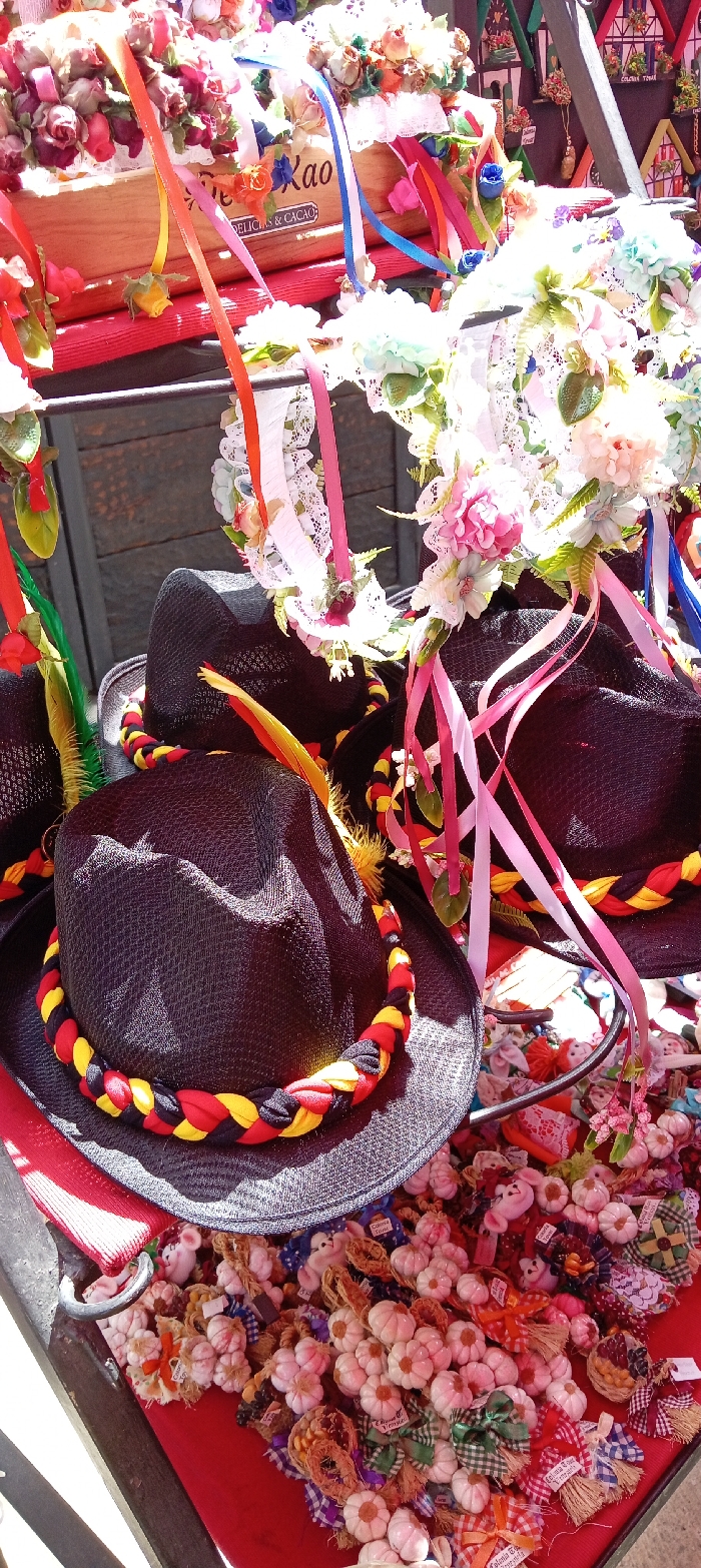 The image presents a detailed view of a market stall display in Colonia Tovar, Venezuela. The scene is illuminated by bright daylight. In the upper section of the frame, multiple floral head wreaths are prominently featured. These wreaths are crafted from artificial flowers in various hues, including pink, white, blue, and green foliage, interspersed with white lace. Numerous colorful ribbons, specifically pink, red, blue, orange, and yellow, cascade downwards from these wreaths. Directly behind some of the wreaths, a light brown wooden crate is partially visible, bearing the text "Kao DELICIAS & CACAO" in dark blue lettering. Further in the background, mounted on a dark surface, are decorative miniature wooden house models or magnets, some of which are clearly labeled "Colonia Tovar." In the mid-ground, several dark-colored, likely black or dark brown, fedora-style hats are arranged. Each hat features a braided band around its crown, composed of red, yellow, and black fabric. Some hats are further adorned with colorful feathers, notably in yellow and green. The lower portion of the image displays a red fabric surface, consistent with a tablecloth, covered with an array of small, artisanal souvenirs. These items include numerous clusters of artificial white garlic cloves, small woven baskets containing what appear to be grains or seeds, and decorative fabric bows in gingham patterns of red, blue, and green. Several of these small items have small white tags attached, some of which explicitly state "Colonia Tovar, Venezuela." No individuals are visible within the frame. The arrangement of items indicates a retail display of local products and crafts.