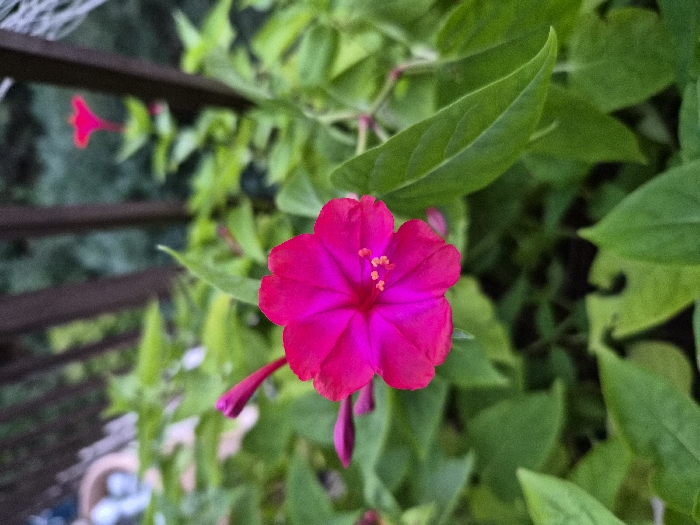 A close-up, vertical-format photograph presents a single, vibrant magenta-pink flower, likely a Mirabilis jalapa, centrally positioned and slightly above the mid-frame. This flower exhibits five distinct petals radiating from a central point, revealing several yellow-tipped stamens. To the immediate left and beneath the primary flower, multiple closed, elongated flower buds of the same magenta coloration are visible. The flower and buds are nestled within abundant green foliage, characterized by ovate leaves that fill the lower and central portions of the image. The background is rendered with a soft, shallow depth of field, displaying additional blurred green vegetation, dark vertical wooden elements suggestive of fence posts or railing slats, and another smaller magenta flower visible in the upper right background. Indistinct, lighter-toned shapes are faintly discernible in the upper left background, possibly indicating distant structural elements. The scene is illuminated by natural, diffused light. This botanical scene is situated in Viroflay, France.