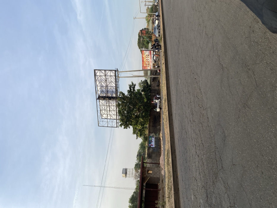 The image displays a daytime street scene in a location identified as Television, Nigeria. The foreground consists of an asphalt road exhibiting extensive surface cracking, bordered by a raised concrete curb. On the left side of the scene, beyond the curb, stands a partially constructed or renovated single-story building made of grey concrete blocks, with an open doorway and piles of earth or sand beside it. Behind this structure, a tall, slender antenna tower and an elevated water tank on a metal frame are visible. A low, plastered perimeter wall extends along the roadside, featuring a multi-person political campaign billboard with legible text. Towards the center, a large, metal-framed billboard, currently devoid of display advertisements on its panels, dominates the skyline, supported by multiple utility poles. Beneath this billboard, a prominent green tree grows. Along the roadside, directly beneath the tree and adjacent to the wall, a white pickup truck with its tailgate lowered is present. Approximately 5-7 individuals are visible gathered around this truck. Several motorcycles are parked or positioned along the curb in this area, with additional individuals standing nearby. Further down the road, another commercial billboard advertising food items is visible. The road in the midground contains several vehicles, including at least one silver sedan and multiple motorcycles, indicating active traffic. Overhead utility lines traverse the sky. The sky is clear, with a pale blue hue and minimal cloud cover. The overall environment suggests a semi-urban or commercial area.
