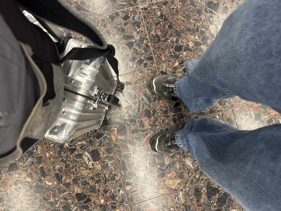 The image presents a top-down view of an individual standing indoors, reportedly in Yagel, Israel. The subject's lower legs are visible, clad in loose-fitting blue denim jeans and dark grey athletic shoes with white soles and multicolored (orange, blue, white) accents, including visible "Salomon" branding on the shoe tongues. Directly in front of the subject's feet is a silver-colored, horizontally ribbed, hard-shell rolling suitcase featuring black wheels, prominent latches, and rivets. A black strap is visible around the suitcase, and a grey soft bag or backpack is partially discernible resting on or behind its top section. The environment consists of a highly polished floor composed of irregular, tessellated stone fragments in shades of dark brown, black, and reddish-brown, reflecting ambient light. The individual is stationary, positioned behind the luggage.