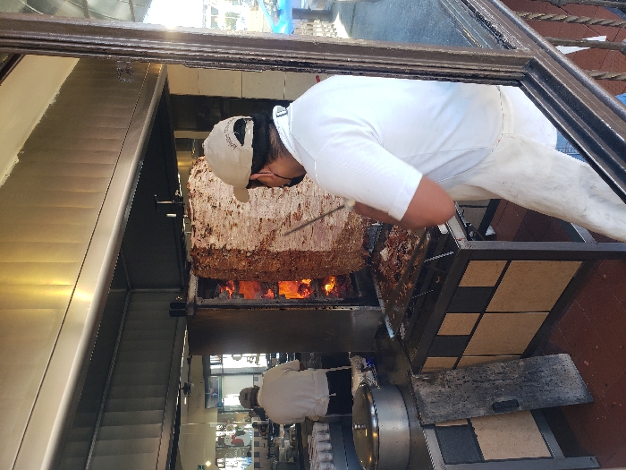 - "A cook in a white uniform and a baseball cap trims meat from a large vertical spit, revealing flames underneath" by FM-zKXAq1, licensed under CC BY 4.0
