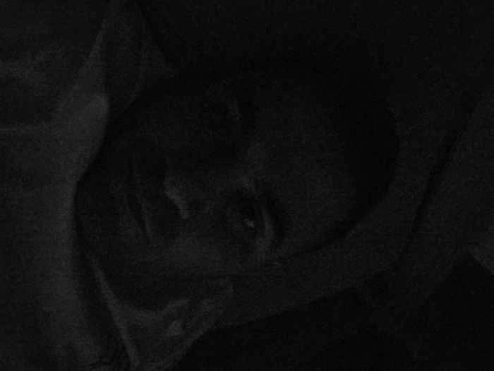 A single individual, presumed to be an adult male, is depicted in an extremely low-light environment within Drazhevo, Bulgaria. The subject's head and upper torso are visible, positioned as if reclining or lying down, with the gaze directed towards the camera. The right eye is discernible, while the remainder of the face, including the nose and mouth, is largely obscured by deep shadows. A light-colored fabric, consistent with a collar or bedding material, is present around the subject's neck and lower facial area. The background is undifferentiated due to the lack of illumination. The image exhibits high levels of digital noise, characteristic of photography in minimal light.