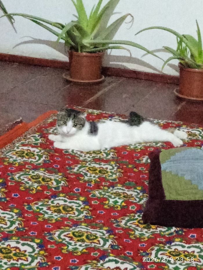 The image captures an indoor domestic scene. A white cat with dark gray and black patches on its head and back is centrally positioned, lying on its stomach with front paws tucked, looking forward. It rests on a red patterned rug featuring repeating motifs in yellow, green, white, and blue. In the background, a dark brown floor meets a light-colored wall, against which two potted Aloe vera plants in brown terracotta-style pots are visible. A dark, possibly maroon, cushion with a multicolored patchwork pattern is partially seen in the lower right corner. The precise location within the city of Khujayli, Uzbekistan, cannot be determined from the visual evidence. No people are present. A digital timestamp "2026/3/9 23 58" is overlaid in the bottom right corner.