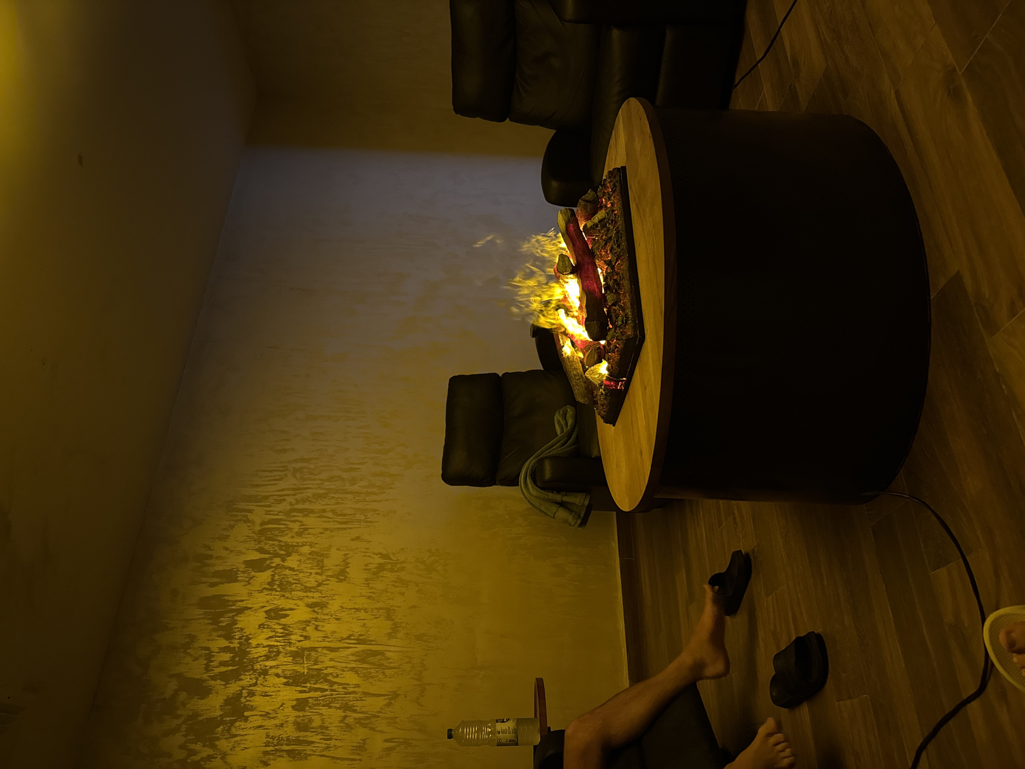 The image displays an indoor relaxation area located in Sapareva Banya, Bulgaria. The room features dimly lit, warm golden-yellow ambient lighting. The walls exhibit a textured, light-colored finish with vertical, distressed patterns. The floor is covered with dark brown, wood-look rectangular tiles arranged in a staggered pattern. In the center of the frame, a dark brown circular coffee table holds an electric fireplace unit. This unit displays artificial glowing logs and simulated flames. Surrounding the coffee table are two black leather recliners. A light green towel is draped over the armrest and seat of the recliner on the right. To the far left, a smaller, circular dark brown side table supports a clear plastic water bottle, approximately half-full. The lower-left quadrant of the image shows the bare legs and feet of a person seated in the recliner on the left. Two black slide-style slippers rest on the floor near the visible bare feet. A third, light-colored slipper is partially visible at the bottom right edge of the frame. An black electrical cord is visible on the floor, extending from underneath the coffee table.