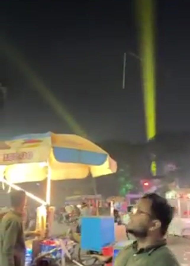 n outdoor scene at night, seemingly in a busy urban area. People are visible, with some looking up at the sky, possibly observing something flying above. There are street vendors with stalls under lit umbrellas, and rickshaws are moving through the streets. Buildings and traffic lights are visible in the background, indicating a city environment. The overall atmosphere suggests a lively night market or a street scene with many people and activities.