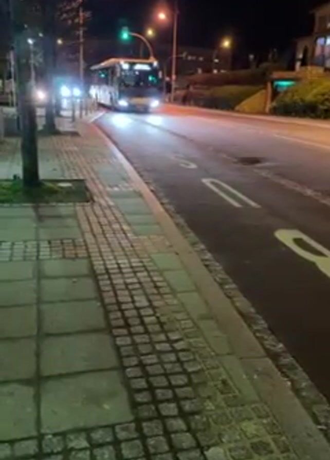 At night, a bus approaches the camera on an empty road. The road has a dedicated bus lane. The sidewalk is paved with square stones. Streetlights illuminate the road, sidewalk, and surrounding area. There are buildings and foliage in the background. The traffic light is green.