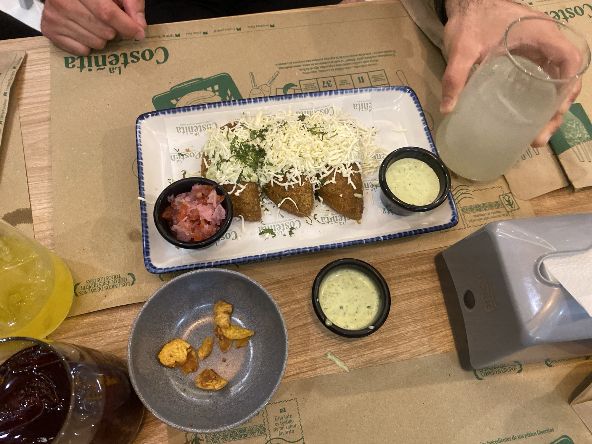 table setting in a restaurant, presumably in La Aurora, Ecuador given the references to "La Costeñita" on the placemats and plates. Two people are visible; one is holding a glass of a clear beverage with ice, while the hands of another person are near the top of the frame. The table is covered with paper placemats bearing the La Costeñita logo and branding. At the center of the table, a rectangular plate features food items, including what appears to be arepas topped with shredded cheese and herbs. Beside this, are two small bowls containing salsa or a similar condiment. A gray bowl contains what seem to be fried plantain chips. Two smaller bowls, also in gray, hold light green dipping sauce. A glass of a dark beverage and a yellow drink are visible on the left, along with a gray tissue box on the right side of the table. The scene suggests a casual dining experience.