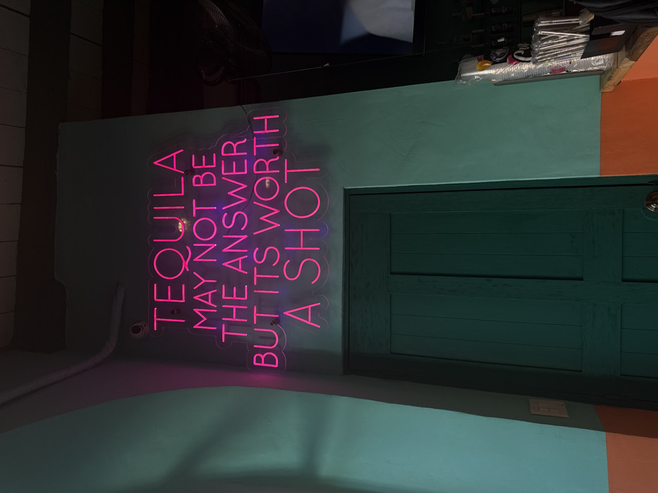 The image presents an interior scene within what appears to be a bar or restaurant in San José del Cabo, Mexico. A prominent, illuminated pink neon sign is mounted on a two-toned wall, displaying the text: "TEQUILA MAY NOT BE THE ANSWER BUT ITS WORTH A SHOT." The wall's upper section is painted a light teal-green, while the lower portion is orange. Centered beneath the neon sign is a dark teal-green wooden door, featuring two vertical panels and equipped with a round metallic doorknob. To the right of the door and extending into the mid-ground, a bar service area is visible. This area includes a counter holding stacked clear plastic cups and a container with straws. Behind these items, dark bottles, likely spirits, are arranged on shelves, and a section of a television screen displaying a blurred image of a person's face is present. A dark-colored fan is partially visible in the upper right corner. No individuals are explicitly depicted in the scene; the ambient lighting is dim, with the neon sign serving as a primary light source.