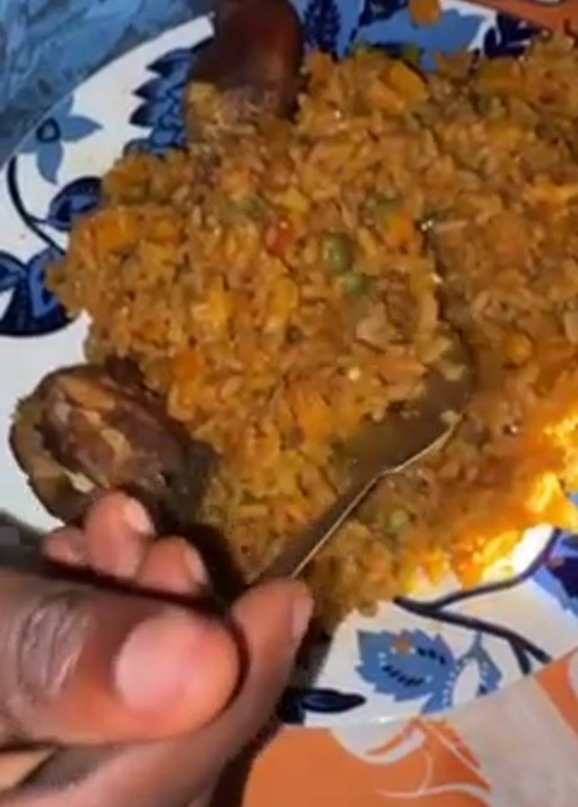 A person with dark skin is eating a meal off a plate. The plate has a blue and white floral pattern. The meal consists of orange-colored rice, with visible bits of green and orange vegetables, and two pieces of dark brown fried food. The person is using a silver fork to take a bite of the rice. The plate is sitting on an orange and white patterned surface. The person is wearing a blue and white shirt. The person is holding a cell phone in their other hand.