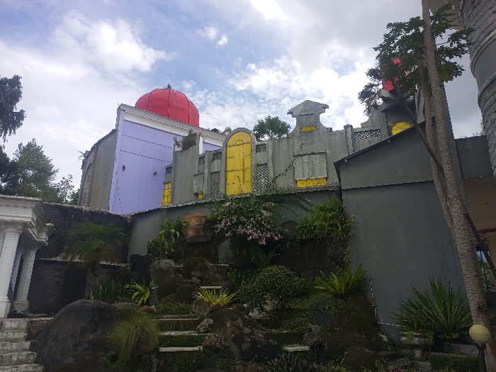 An upward-angled view captures a distinctive multi-level building complex in Gadog, Indonesia, under a partially cloudy sky