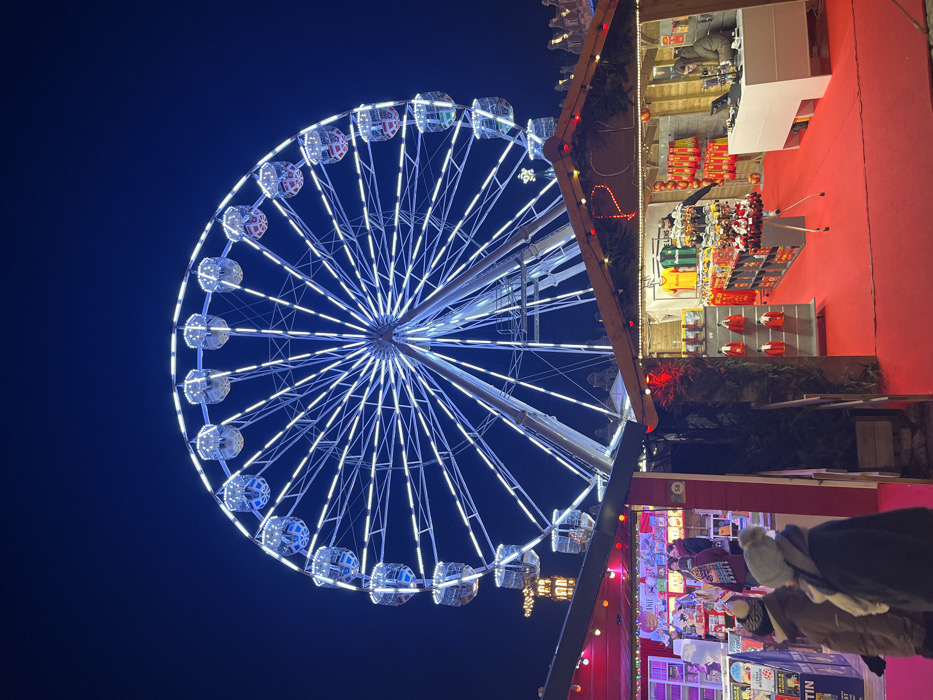A Ferris wheel illuminated with white lights dominates the dark blue evening sky