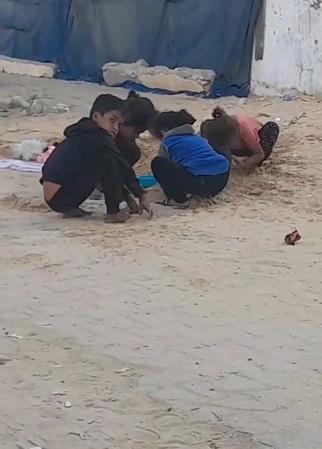three children playing in the sand. The child in the forefront is wearing a black jacket and appears to be a boy. Two other children are in the background. One is wearing a blue vest and black pants; the other child is wearing a pink shirt. The children are playing near what appears to be a white building with a blue tarp draped nearby. A discarded toy car is also visible.