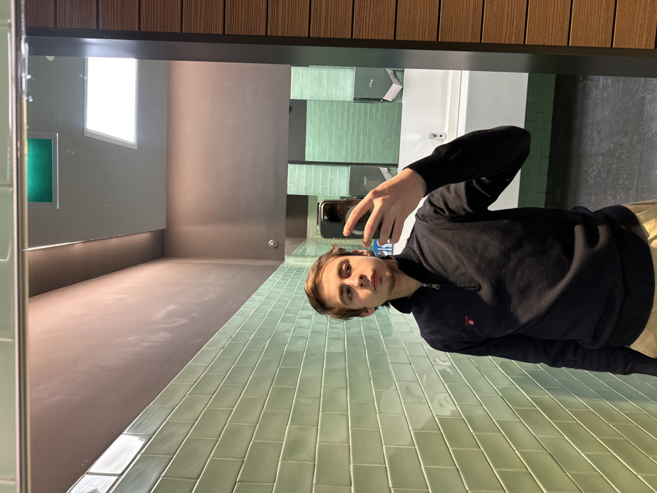 A mirror reflects a young man taking a selfie in a public restroom. He wears a dark blue zip-up sweater and khaki pants, holding his phone in his right hand. The restroom features light green tile on the walls and floor. Reflected in the mirror is a minimalist space with a large window, a green rectangular panel, a sink, and toilet paper dispensers. Above the mirror is a wood-paneled ceiling.