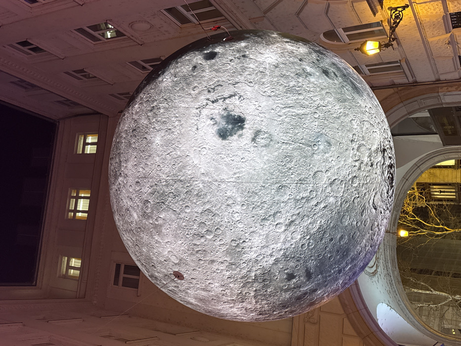 - "An illuminated, spherical model of the moon hangs suspended between buildings in an urban environment" by FM-nRr0I2, licensed under CC BY 4.0
