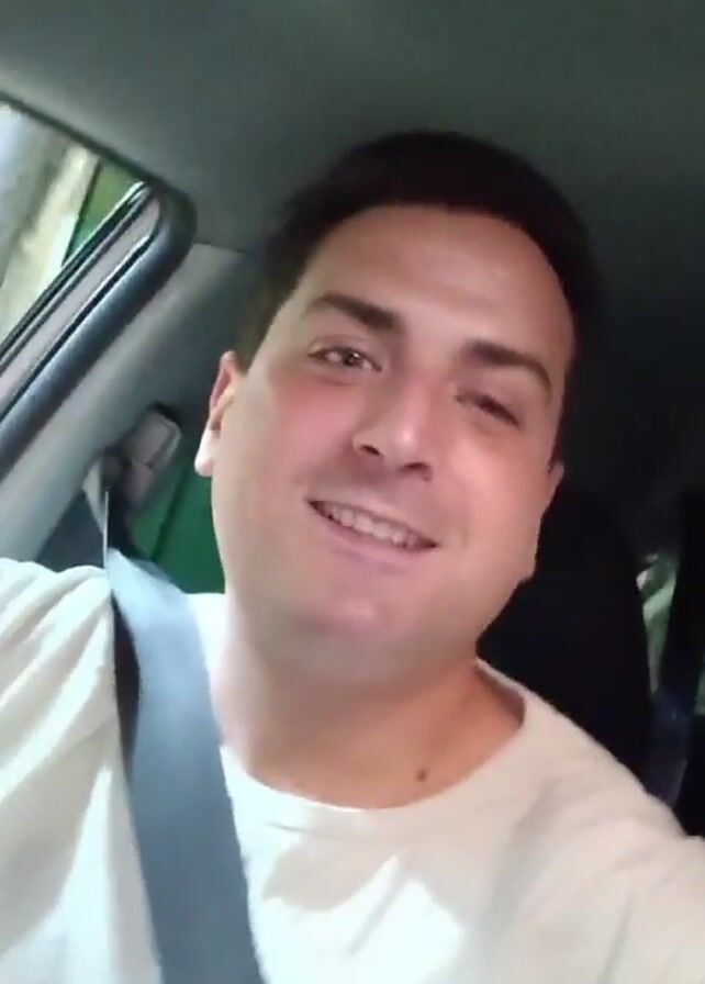 man in a car. He is wearing a white t-shirt and a seatbelt. He smiles at the camera as music plays in the background. The car is parked, visible through the window. The lighting is somewhat dim.