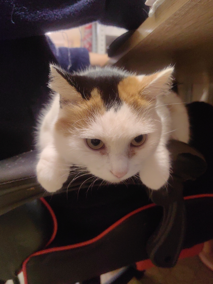 A calico cat is perched on a black and red gaming chair. Its white paws are draped over the chair's edge. The cat's head is positioned downward, as if looking directly at the viewer, and it has light brown eyes and a pink nose. Above the cat, there's a dark navy fabric that appears to be clothing. The background includes blurred elements of a desk and items, suggesting an indoor setting.