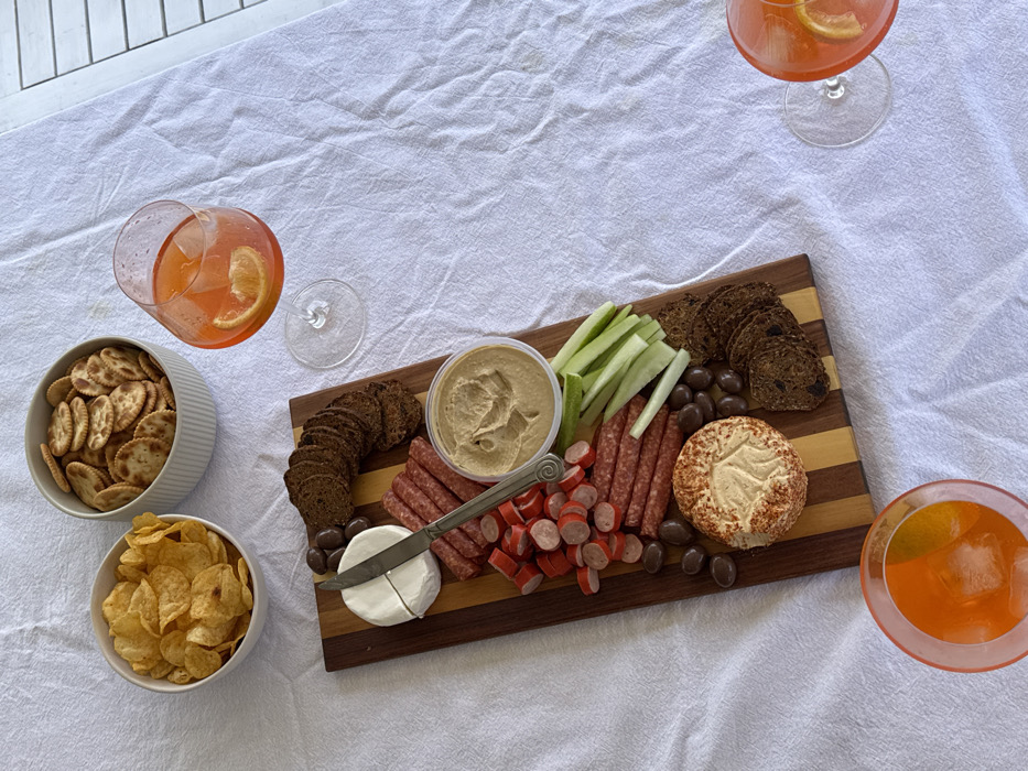 A wooden charcuterie board is centered on a white tablecloth, containing hummus, sliced cucumbers, salami, chopped hotdogs, bread, olives, and cheese. A knife rests on the brie. Two bowls, one with crackers and another with chips, are on the left. Three glasses with orange liquid are positioned around the board.