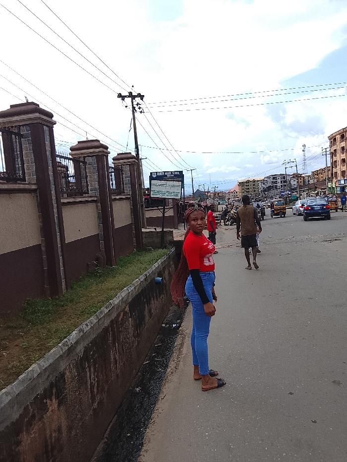 The image displays an urban street scene in Onitsha, Nigeria, identified by a sign reading "Dennis Memorial Grammar School Onitsha" visible on the left side. A young Black female stands in the foreground, facing the camera, positioned at the edge of an asphalt road and a concrete-lined drainage ditch. She wears a red short-sleeved t-shirt over a black long-sleeved undershirt, light blue jeans, and dark slide sandals. Her hair is styled in long, reddish-brown braids extending down her back. To the left of the main subject, a concrete drainage ditch runs parallel to the road, separating it from a two-toned wall, predominantly brown, featuring decorative pillars and topped with a dark metal fence. The aforementioned "Dennis Memorial Grammar School" sign, blue with white text, is visible behind this wall. A wooden utility pole with multiple overhead power lines stands near the wall. Further down the asphalt road, a Black male wearing a dark t-shirt and dark shorts walks away from the camera. Multiple vehicles are present on the road in the mid-distance, including a dark blue sedan and a yellow auto-rickshaw (keke napep), indicating active traffic. Multi-story buildings line both sides of the street, receding into the background under an overcast sky.
