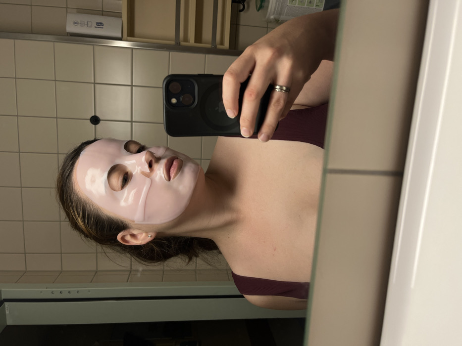 This image depicts an indoor scene within a bathroom, stated to be located in Bad Kreuznach, Germany. The primary subject is a female individual reflected in a mirror, taking a selfie with a black smartphone. She has brown hair, visible on the left side, and is wearing a light pink or translucent sheet face mask covering her face, with cutouts for eyes, nostrils, and mouth. A small stud earring is visible on her left earlobe. She is dressed in a dark red ribbed tank top or camisole. Her left hand, holding the smartphone, displays a two-banded ring on the fourth finger. The bathroom environment includes light beige square wall tiles with dark grout, a metallic vertical rail on the right, and a partial view of a white rectangular dispenser on a shelf. A light-colored sink or countertop forms the foreground base of the mirror reflection. A door frame is visible on the far left, and a black circular object is affixed to the tiled wall.