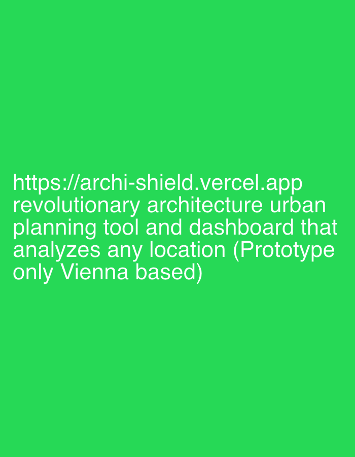 The image displays a solid bright green background. White, sans-serif text is centrally positioned on this background. The text reads: "https://archi-shield.vercel.app revolutionary architecture urban planning tool and dashboard that analyzes any location (Prototype only Vienna based)". No people, subjects, objects, actions, or interactions are depicted. The environment is purely a digital graphic. There is no physical location in Krems an der Donau, Austria, depicted within this image. The text describes a software prototype stated to be Vienna-based.