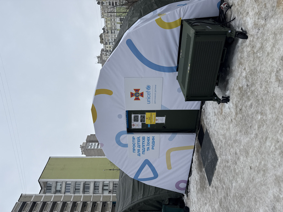 An outdoor scene in a residential area of Kyiv, Ukraine, features a humanitarian assistance point under an overcast sky. The primary subject is a large, white, arched tent with a pitched roof, decorated with abstract blue, yellow, and purple arc and circular designs. On the left side of the tent, text in Ukrainian reads "ПРОСТІР ДЛЯ ДІТЕЙ, ПІДЛІТКІВ ТА ЇХНІХ РОДИН" (SPACE FOR CHILDREN, ADOLESCENTS AND THEIR FAMILIES). On the right, the UNICEF logo is displayed with the text "unicef ДЛЯ КОЖНОЇ ДИТИНИ" (FOR EVERY CHILD). Above a dark green, rectangular door in the center, the red emblem of the State Emergency Service of Ukraine is affixed. A yellow sign on the door states "ПУНКТ НАДАННЯ ДОПОМОГИ" (ASSISTANCE POINT), accompanied by other taped papers. To the left of this tent, a portion of a larger, dark green military-style canvas tent is visible. To the right, a dark green, rectangular unit with a gridded top and wheels, consistent with a portable generator, rests on the ground. The ground is covered with patchy, dirty snow and ice, with two dark, rectangular grated mats placed in front of the tent's door. In the background, multiple multi-story residential apartment buildings are visible; one prominent building on the left features a light green facade, flanked by gray structures. No people are present, and no actions or interactions are depicted.