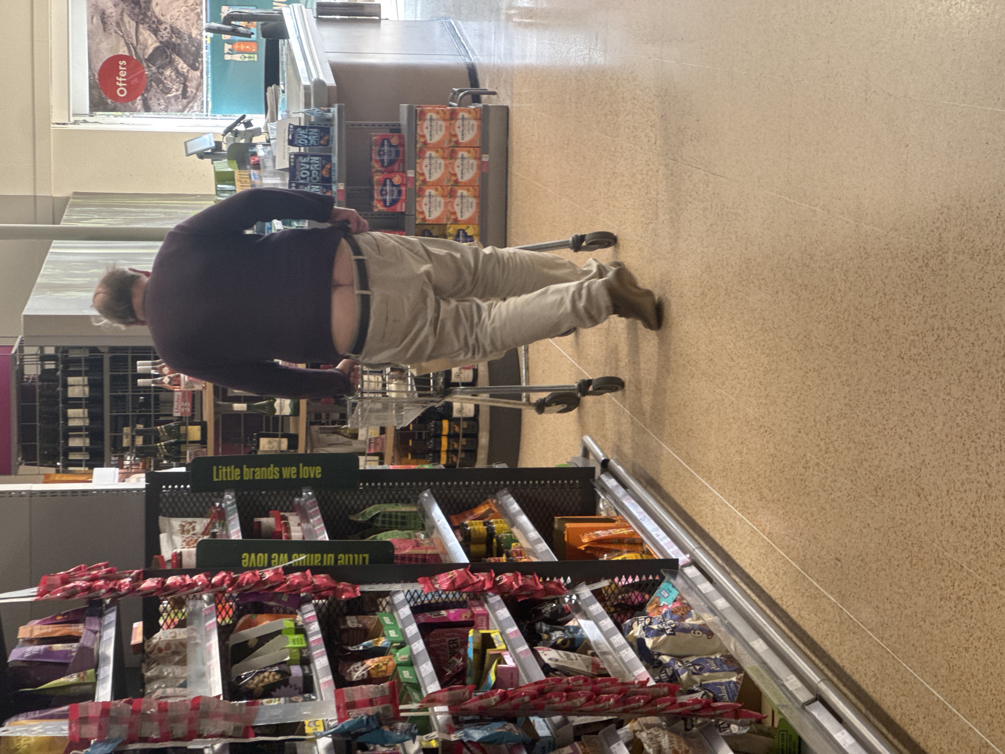 Here is a forensic description of the image. The image shows a man wearing a dark sweater and beige pants. His pants are pulled down, exposing his buttocks. He is wearing brown shoes and appears to be pushing a shopping cart in what looks like a supermarket aisle. The aisle is stocked with various food products, including snacks and other items. Signs above the shelves read "Little brands we love." The location appears to be a supermarket, likely in South Kesteven, United Kingdom.